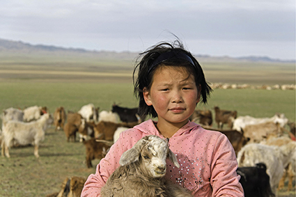 Mangée au sud par la steppe semi-aride du désert de Gobi, bordée au nord par la taïga, à l’ouest par les hauts sommets de l’Altaï, la Mongolie est une terre d’altitude au climat continental rude; plus 40 degrés en été et moins 40 degrés en hiver. C’est un univers grandiose et violent, mais également un havre de paix pour les troupeaux qui s’y déplacent sur de vastes espaces.